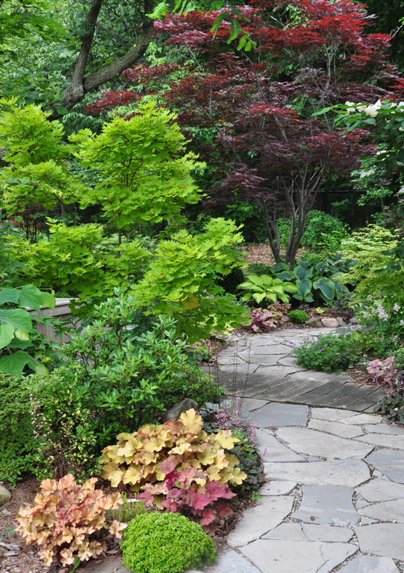 Part to full shade–Heuchera in the foreground– Private garden in the Toronto Beaches.