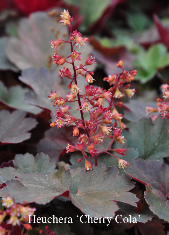 Heuchera 'Cherry Cola' has reddish-brown leaves and cherry-red flowers in late spring/early summer. Full sun or part-shade. Height: 40-45 cm (16-18 in), Spread: 30-40 cm (12-16 in). USDA zones: 4-9.