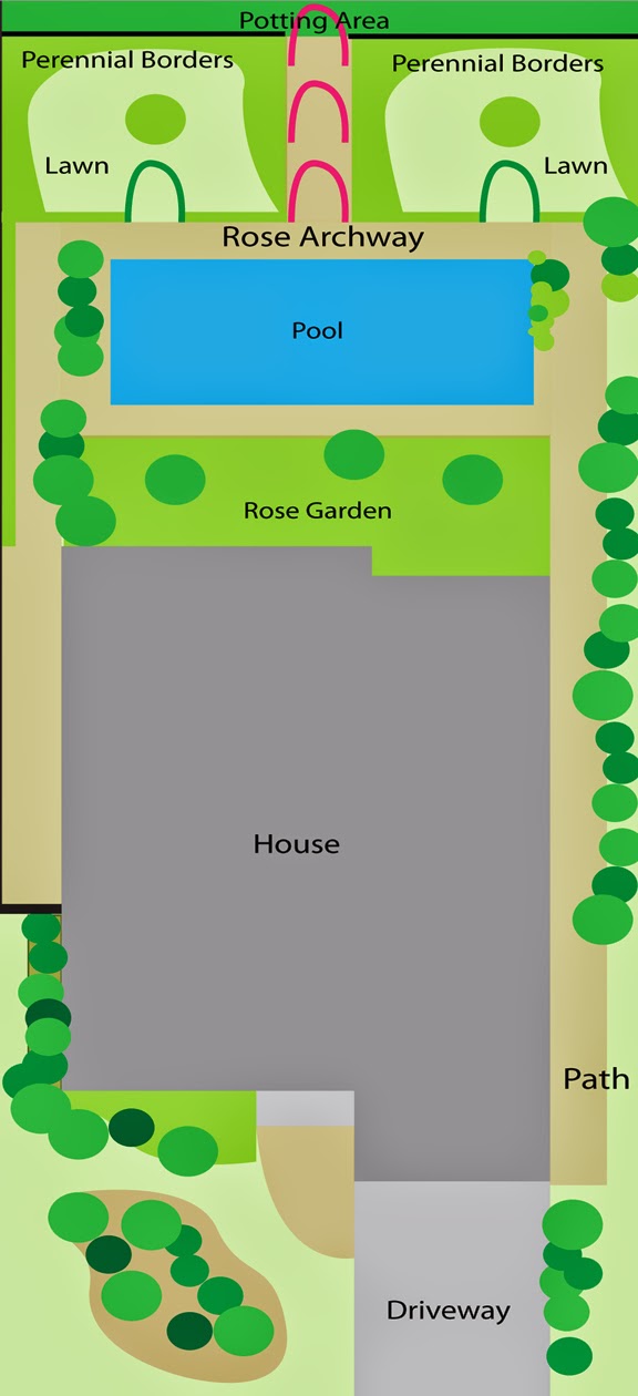 The drawing above is a very rough layout of the garden. Pathways take you down either side of the house and into the backyard. Right outside the back door there is a garden of roses and perennials. Just beyond that is a swimming pool and deck area. Toward the back of the property there are two symmetrical gardens with a central area of lawn in each. Then, back through a series of rose covered arches, is a potting area.