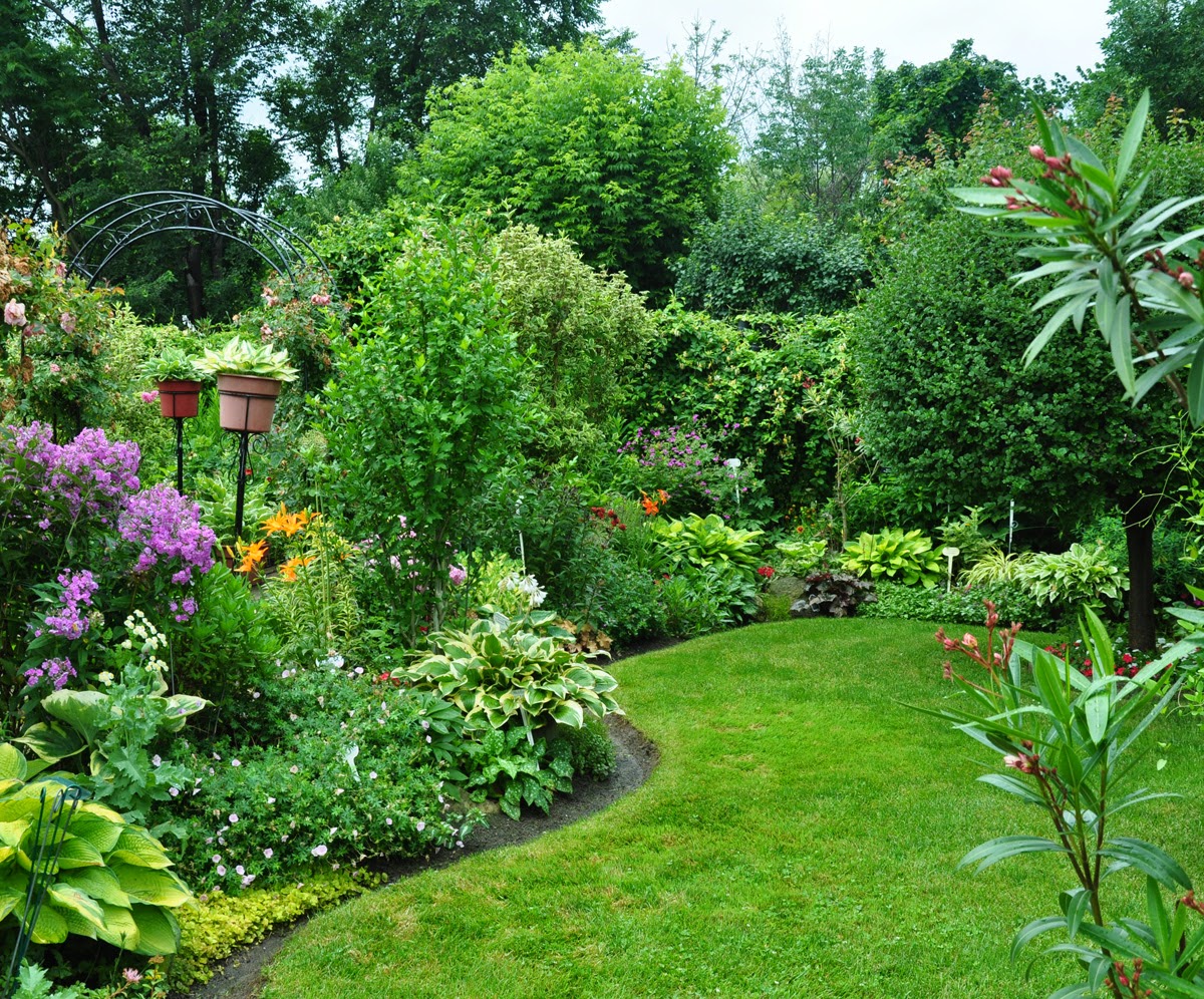 A mix of perennials including several hosta, a Brunnera, a Heuchera and a Pulmonaria.