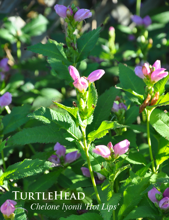 Turtlehead, Chelone lyonii 'Hot Lips' has pink hooded flowers from August into September. Turtlehead prefers moist soil, but does fine enough in my garden. Full sun or light shade. Height:60-90 cm (18-23 inches), Spread: 45-60 cm. USDA Zones: 3-9.