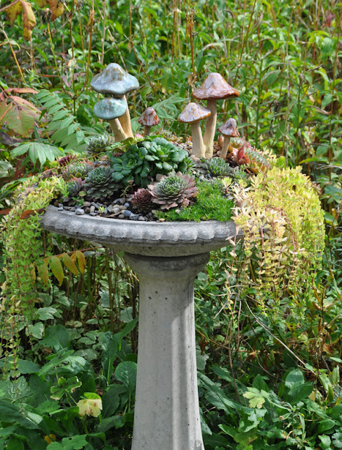 One of my birdbath planters. The ceramic mushrooms are from the Dollar Store.
