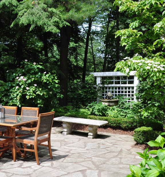The trees on the property tower over the former carriage house. Many of these trees are part of the original forest and have never been cut. Into this very special woodland, Jamie has incorporated both native and shade-loving plants.