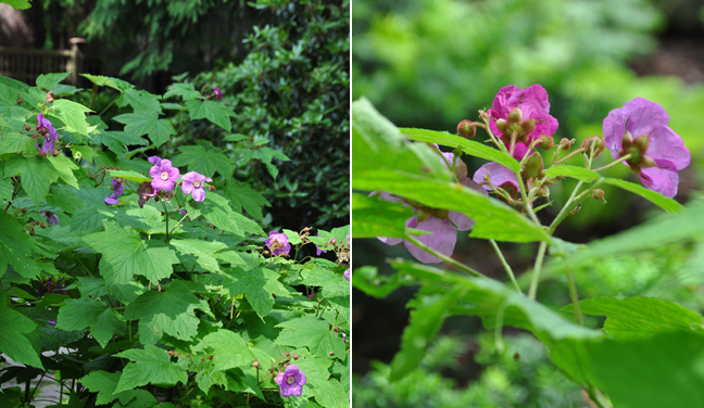 Purple Flowering Raspberry, Rubus odoratus is native of Eastern North America. It is a deciduous shrub with thornless, cane-like stems and purplish-magenta flowers. Cup-shaped, red fruits which are edible, but not particularly delicious, follow the rose-like flowers. Please note that this plant spreads fairly aggressively. Full sun to light shade. Average to moist soil, well-drained soil is best for this plant. Height: 3-6 feet, Spread: 6-12 feet. USDA zones: 3-8.