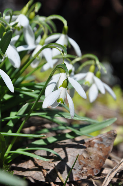 Planted just last fall, these Galanthus elwesii are larger than common snowdrops and have two leaves that wrap around the stem of each bloom stock. The markings on the flowers are also slightly different from the snowdrops in the opening pictures.