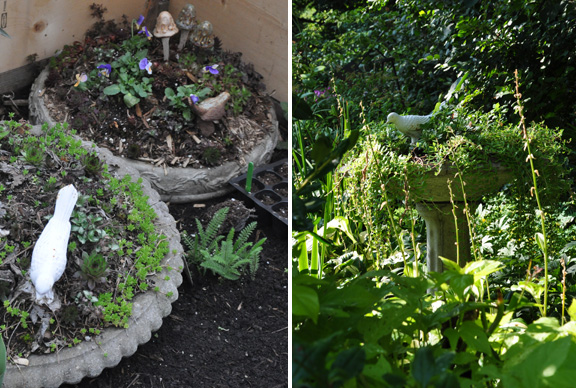 This year, I have had the luxury of being able to store the tops to the two birdbaths inside the relative warmth of the cold frame. As you can see, they have come through this long, drawn out winter just fine and are even springing back to life.