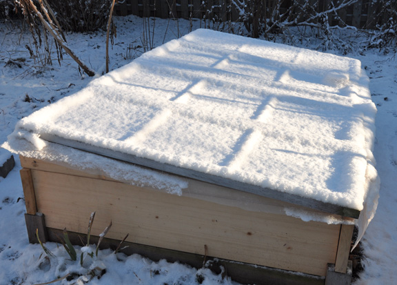 In a mad rush last fall, we fashioned a cover for the cold frame using a sheet of clear plastic and some old windows that a neighbour kindly lent us for the winter. As luck would have it, the four old windows fit together perfectly to cover the frame.