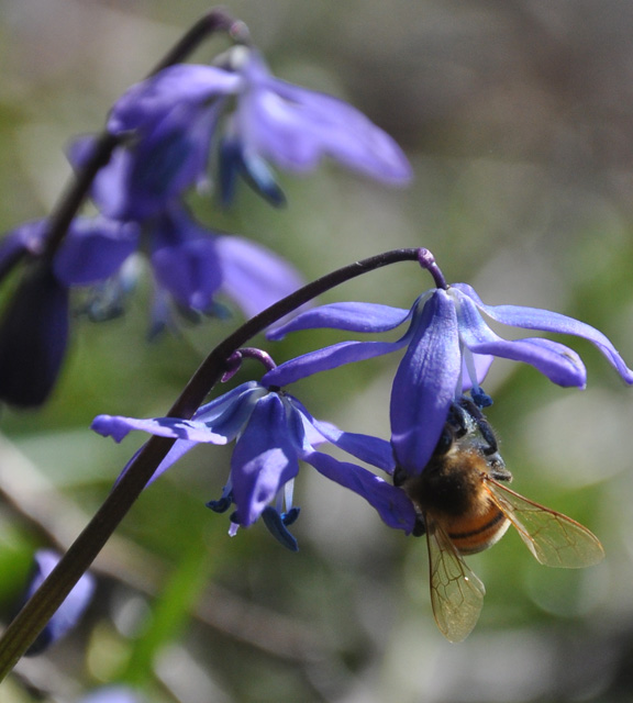 The blue scilla that he planted alongside the snowdrops are blooming to
