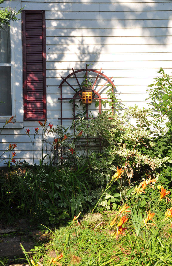 I don't want to get too off topic yet again, but while we are at the side of the house, here is a simple idea for you: Paint a wooden trellis an interesting color and hang a birdhouse on it. If that is too cutesy for your tastes, a sun or lion's head medallion might look just as terrific.