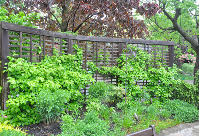 "Most of the garden is in partial shade, so you'll find various shade-loving plants. Marjorie Harris (well-known Canadian gardening writer) thinks we have far too many hostas, and she's probably right, but they come in such variety and are so easy to grow, one has to love them...We try to keep the colours to green, white and blue, but you'll find the occasional pink and mauve, and we've planted forsythia for colour in spring."