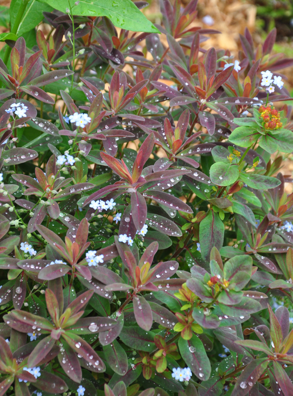Euphorbia polychroma 'Bonfire' has green foliage when it first emerges in the spring. The leaves quickly turn into a mix of burgundy and green. The "flowers" are actually bright orange and yellow bracts. In fall, the deep burgundy color seems to intensify and the plant becomes magical when covered with frost crystals. Full sun and normal or sandy, dry soil. This Euphorbia has a milky sap that is irritating to the skin, so it's a good idea to wear gloves when you are doing any pruning. Height: 25-30 cm ( 10-12 inches), Spread: 30-45 cm (12-18 inches). USDA Zones: 5-9.